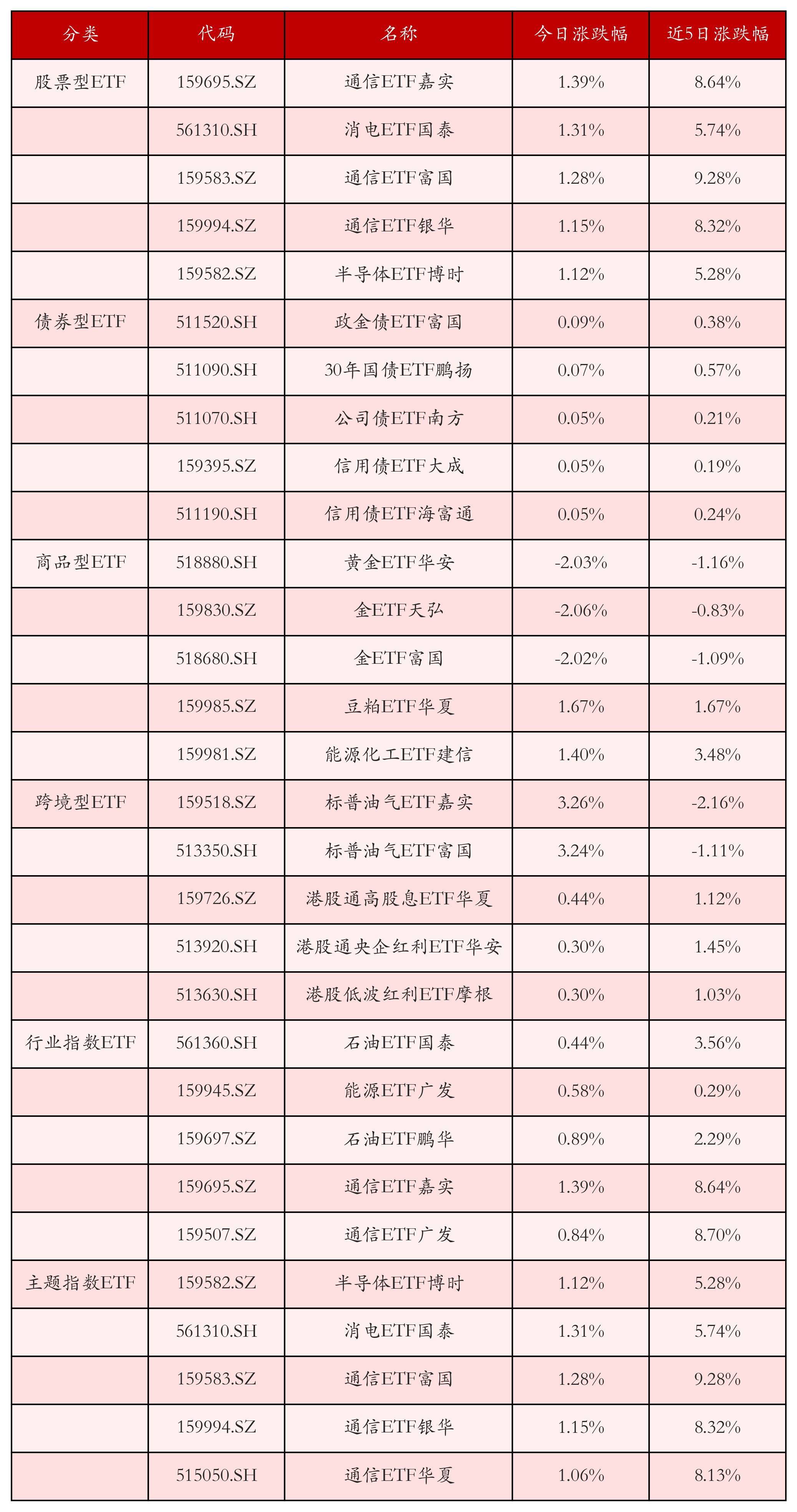 从不同投资种类、行业、主题的ETF产物中找出当天走势行情排行前5的ETF基金,当天涨幅靠前的ETF产物如下表所示。股票型ETF中涨跌幅排行前3位的ETF产物分别为通讯ETF嘉实(159695.SZ)、消电ETF国泰(561310.SH)和通讯ETF富国(159583.SZ),当天收益率分别为1.39%、1.31%和1.28%。