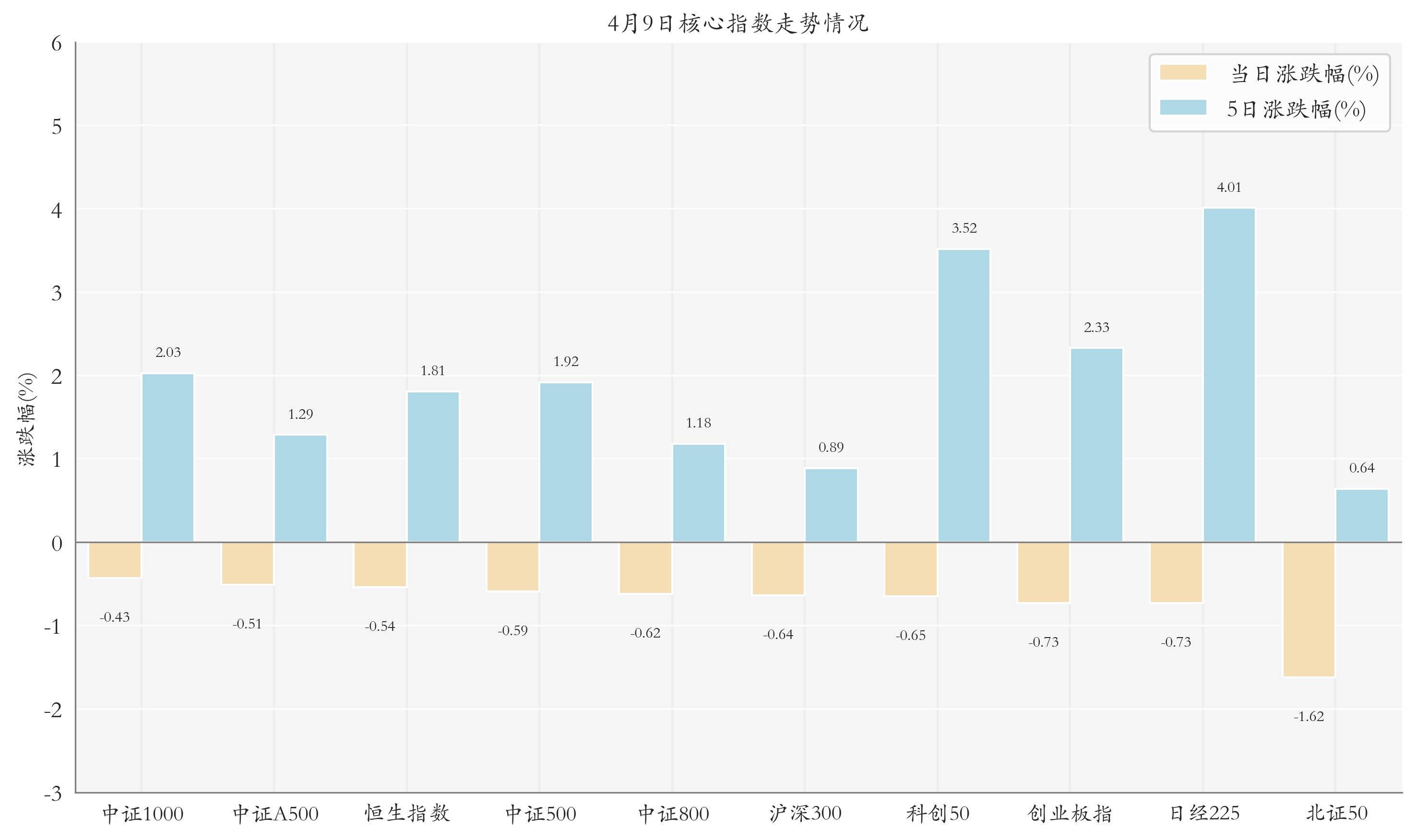二、当天行情速览1.指数走势统计A股与外洋主要中枢指数走势,当天(4月9日,下同)三大指数集体下落,其中上证指数下落0.72%,收于3966.17点,日内最高3979.13点;深证成指下落0.33%,收于13996.27点,日内最高14058.05点;创业板指下落0.73%,收于3323.3点,日内最高3340.3点。当天中证1000、中证A500与恒生指数走势排行靠前,日涨跌幅分别为-0.43%、-0.51%与-0.54%;近5个交畴前日经225、科创50与创业板指的走势排行靠前,近5日涨跌幅分别为4.01%、3.52%与2.33%。