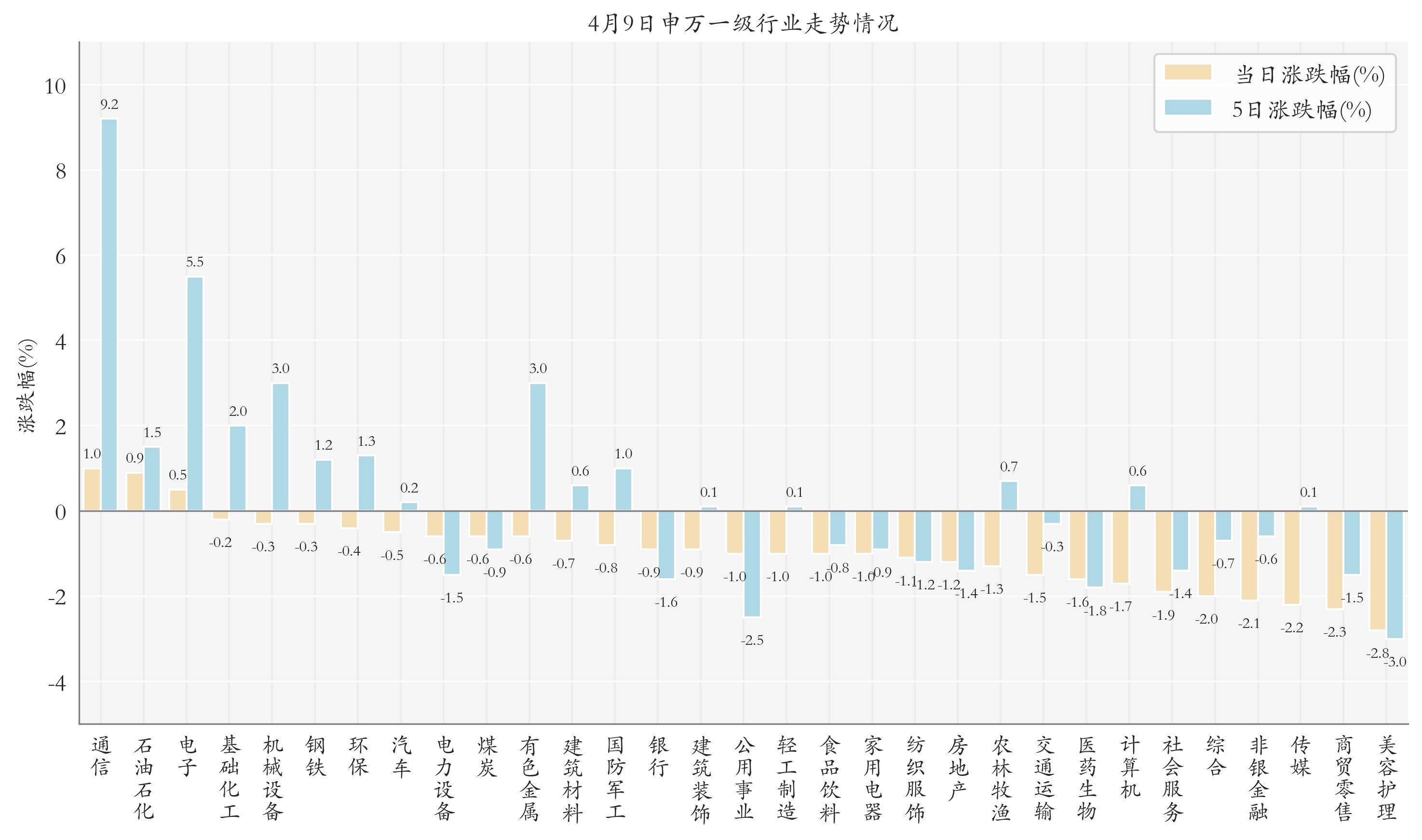 统计当天扫数申万一级行业涨跌幅情况,通讯、石油石化与电子当天走势排行靠前,日涨跌幅分别为1.01%、0.89%与0.49%,好意思容顾问、商贸零卖与传媒的走势排行靠后,日涨跌幅分别是-2.81%、-2.26%与-2.24%;近5个交畴前通讯、电子与机械设备的走势排行靠前,近5日涨跌幅分别为9.17%、5.5%与2.99%,好意思容顾问、公用作事与医药生物的走势排行靠后,近5日涨跌幅分别为-3.0%、-2.51%与-1.81%。