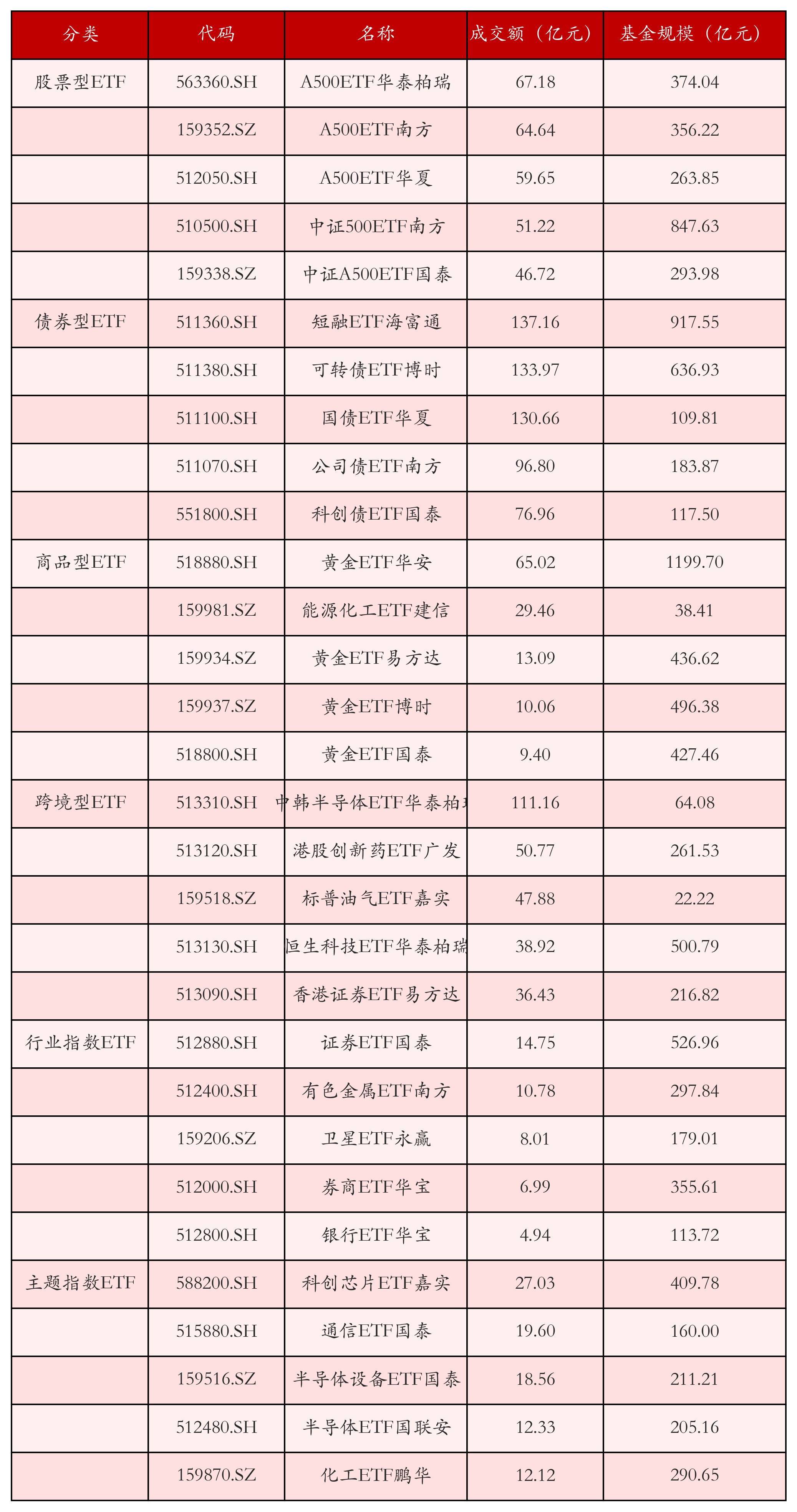 基于成交额对各样ETF当天的成交情况进行统计,成交额靠前的ETF产物如下表所示。股票型ETF中成交额排行前3位的ETF产物分别为A500ETF华泰柏瑞(563360.SH)、A500ETF南边(159352.SZ)和A500ETF中原(512050.SH),当天成交额分别为67.18亿元、64.64亿元和59.65亿元。