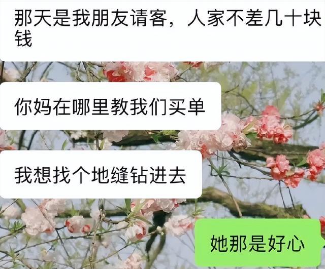他还认为,一又友宴客吃饭不差那几十块钱,她的姆妈还在那儿教他们买单,这令他很轻侮:“我思找个地缝钻进去。”
