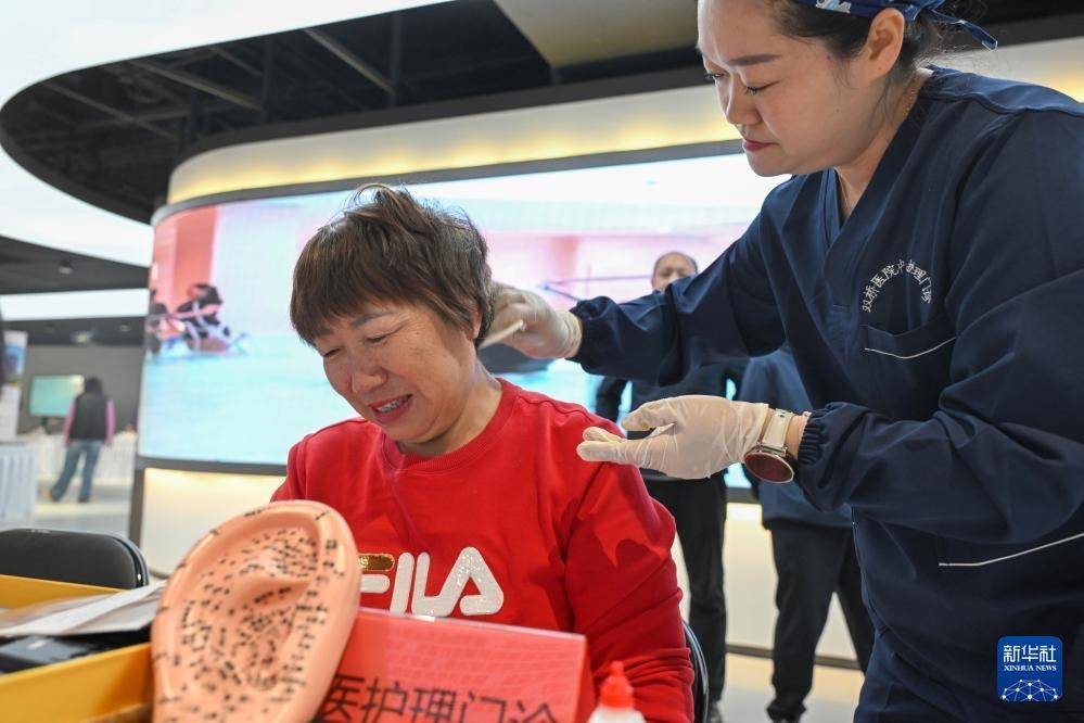10月25日,北京市向阳区双桥病院职工在“敬老月”主题活动上为市民刮痧。